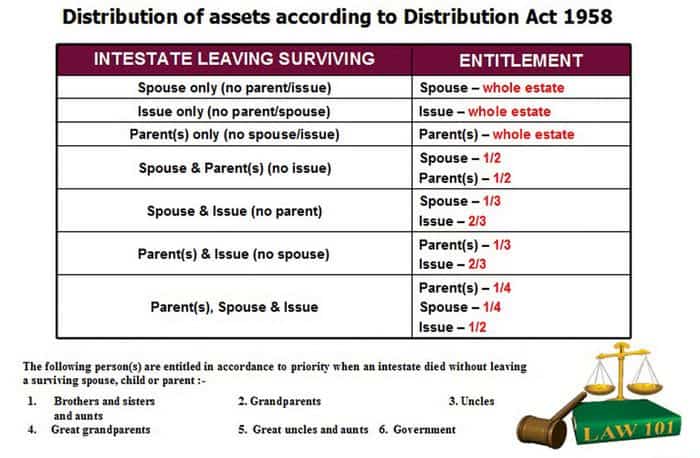 Or if the parents are no longer around, one-third goes to the spouse and two-thirds to the child(ren). In this instance, the deaths of the parents have to be proven through their Death Certificates, which could be a hassle if they passed away many years ago. A lawyer would then have to be engaged to extract the certificates from the National Registration Department.